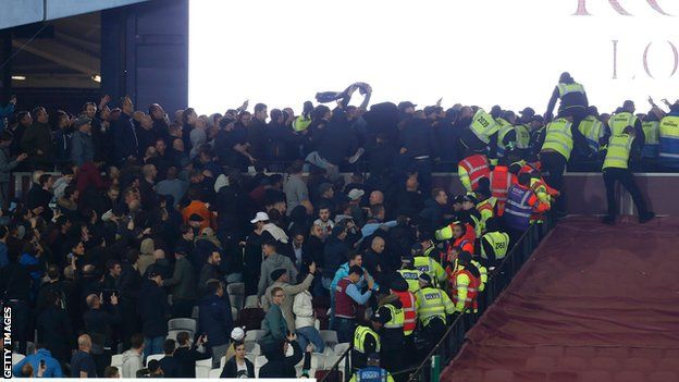 Mechi hiyo hata hivyo ilikumbwa na vurugu za mashabiki.Chupa za plastiki na viti vilirushwa mamia ya mashabiki walipokabiliana karibu na mwisho wa mechi.